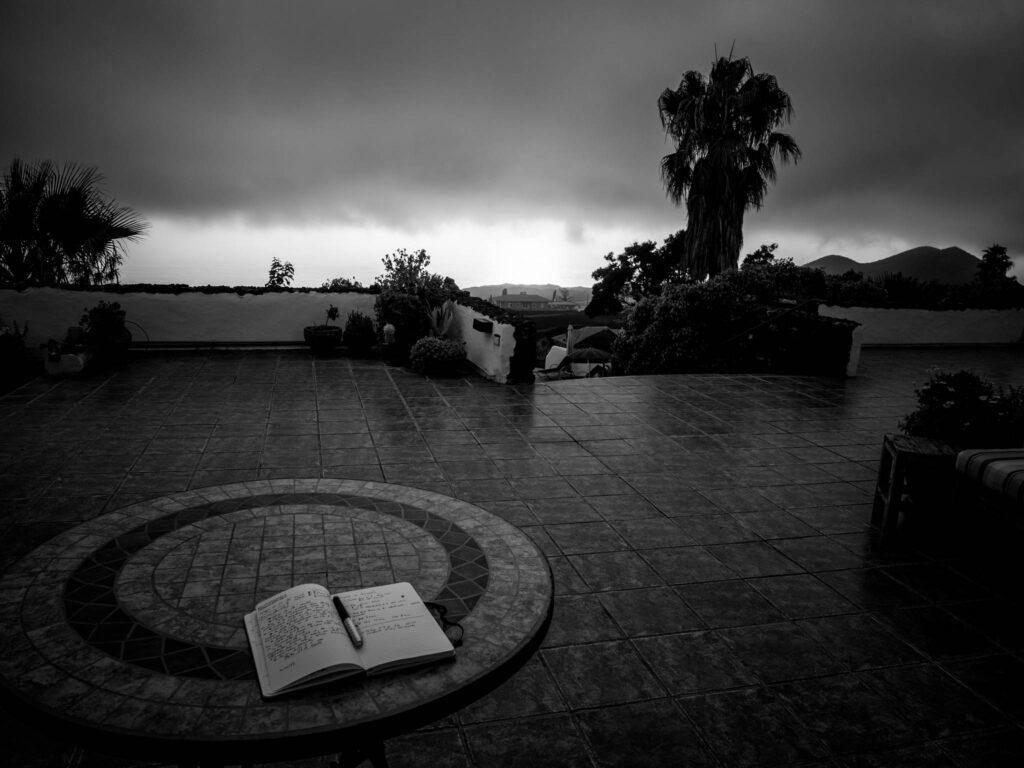 Me ha encantado ese escenario, escribir en una libreta bajo el manto negro de las nubes. Una fotografía preciosa, aunque me hubiera gustado descubrir tu caligrafía, que, por más que he aumentano de tamaño la pantalla no lo he conseguido.